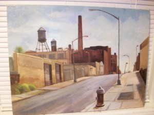 This is a landscape I painted in Williamsburg, Brooklyn. I’m fairly certain I painted it in 1996 because I remember having only one small child at the time. ( I really should date and sign my work.) I was always fascinated with water towers, smoke stacks and the gritty brick of city buildings. The wear and weathering of decades old masonry lends itself to beautiful shades of reds and yellow ochers. As I wandered up and down these Brooklyn streets looking for a place to plant my paint box, this view caught my eye.