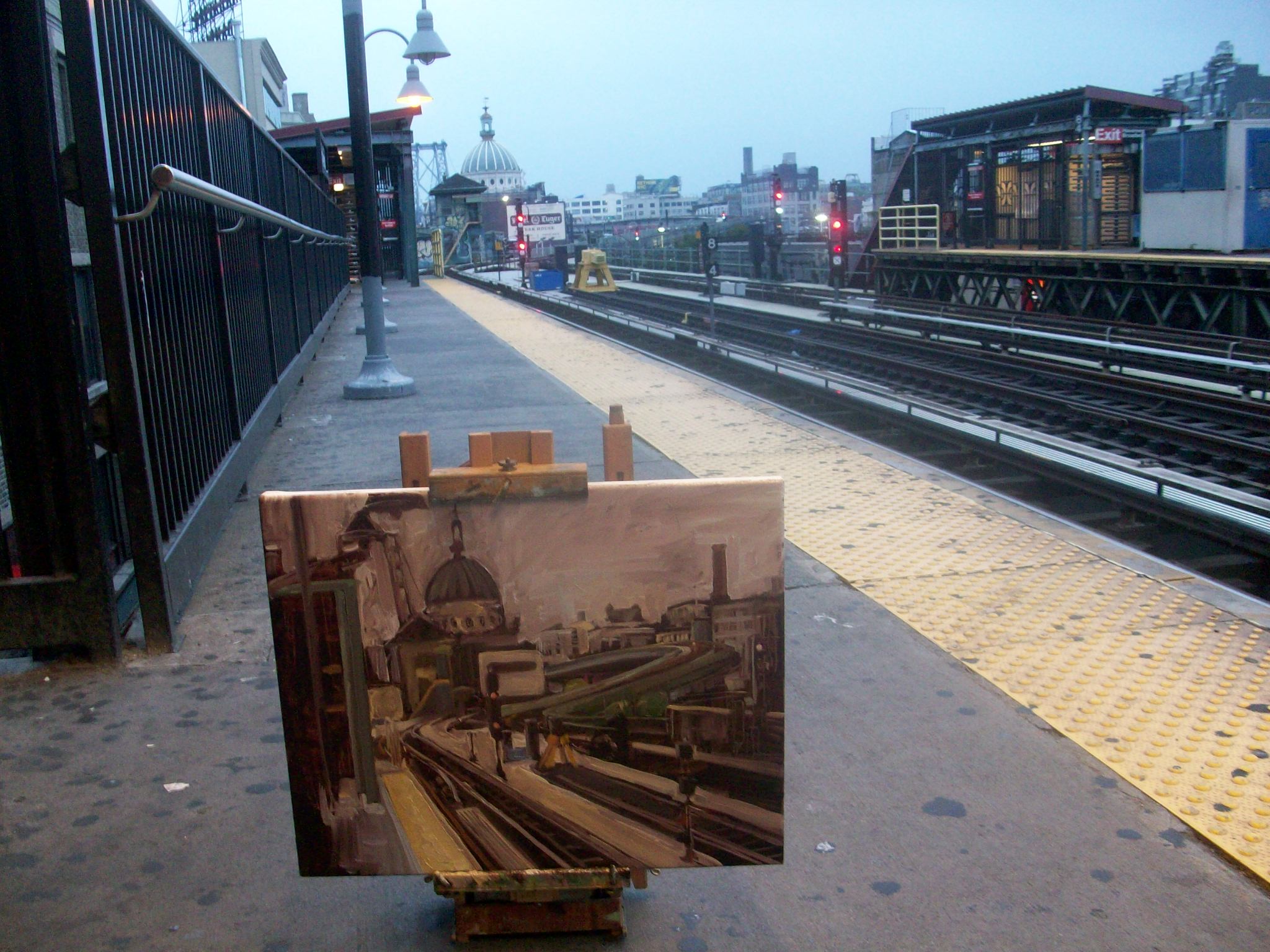 The Marcy stop on the J train was recommended to me by an MTA employee when I was painting on the Knickerbocker line a few weeks ago. That’s when I walked up and down both sides of the platform until I found this spot. This is the last stop in Brooklyn before you go over the Williamsburg Bridge into Manhattan.