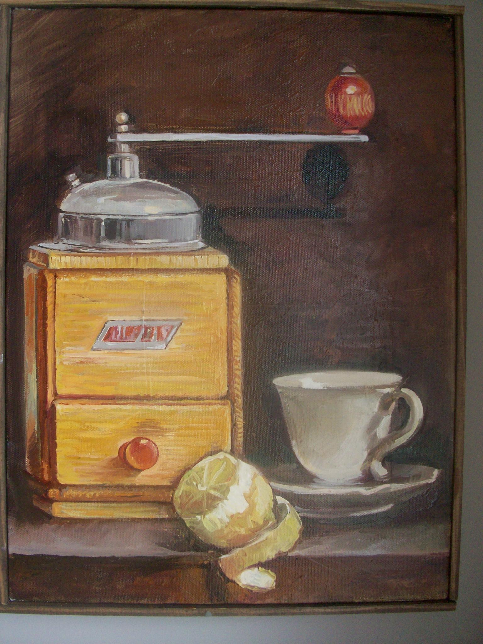 I did wander off the beaten path and worked on these two paintings. The coffee grinder is a work in progress. It’s officially finished and has been in a show. However, it hangs in my kitchen and I see it every day. On a day like today it said, “Hey take me down and add some orange reflection to the red knob and while you’re at it, use that T-square to straighten out that one line.” So I did. And when I asked my kids if they saw anything different about the painting they all said, “NO.”