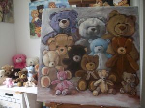 This painting is the result of a bunch of teddy bears piled up in the corner of my studio from a series I did a couple of years ago. They look at me all day. They are always behind my back with their many sets of plastic eyes staring at me. They all seem to be having fun making small talk yet freezing into position with a smirk or innocent smile as I turn around. They were doing things to my psyche so I decided to bunch them all up into a group and paint a picture. Hey, if you can’t beat them – join them. I’ll be coming back to work on this bunch of fluff later.