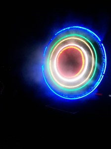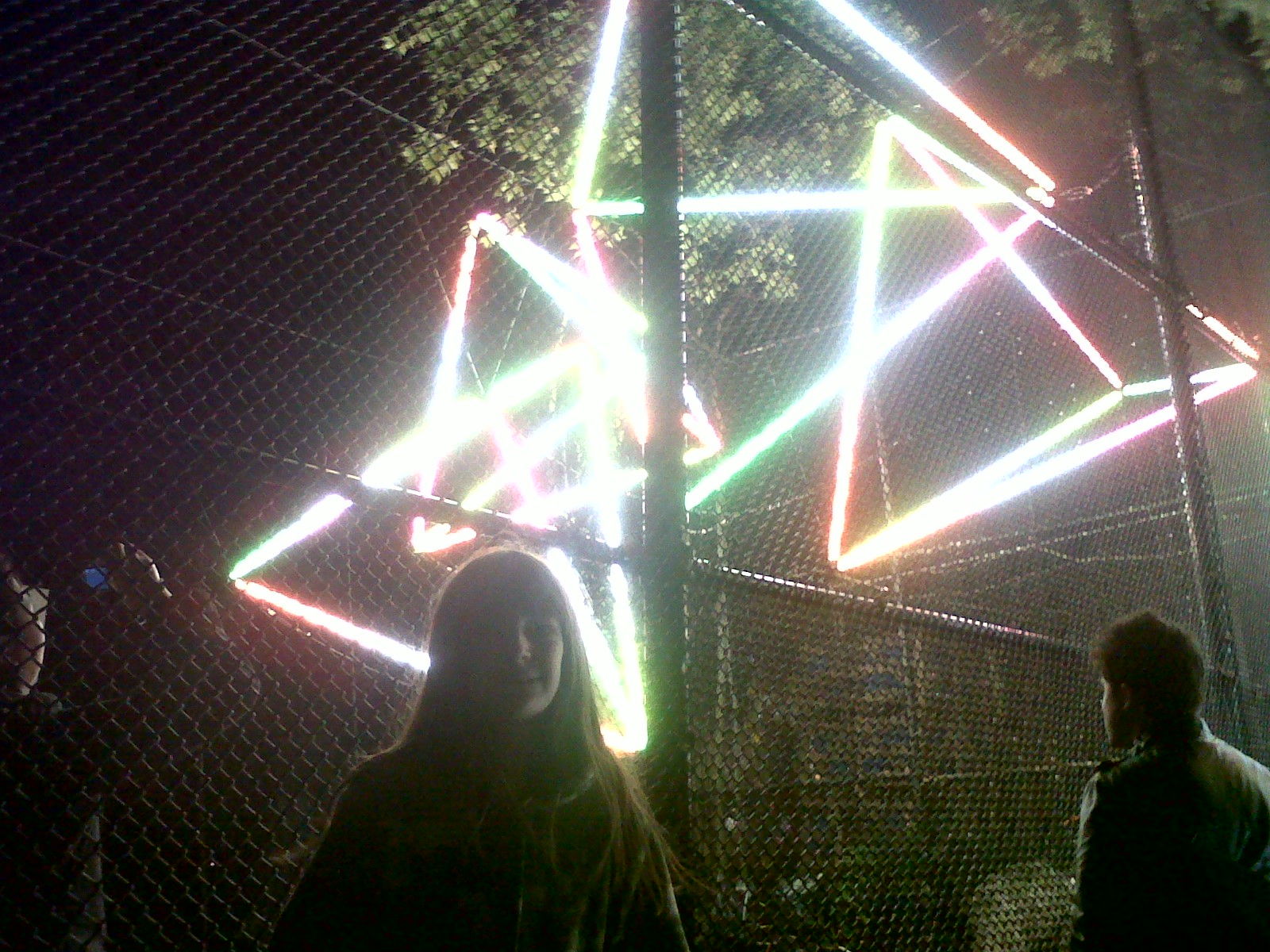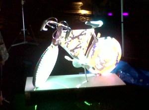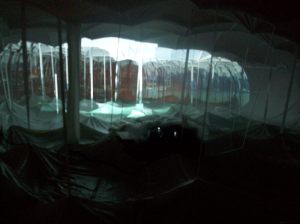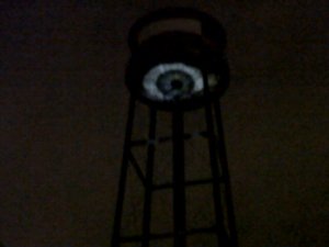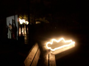 When we arrived we drove by the main festival area looking for a parking spot. My daughter kept saying, “Mommy look! Look up at the eye in the sky!” I took quick looks but preferred not to run over pedestrians. When we did get over there on foot I finally saw a huge blinking eye projected onto the bottom of an old water tower. It definately had the feel of a wierd sci-fi movie; a lone eye searching around looking for you- following you from its ten story perch above. It was my favorite.
