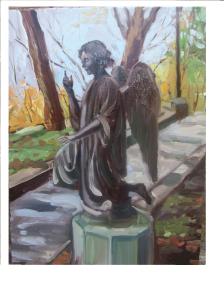 This is where I found a spot to paint, almost at the top of a wooded hill where the beautiful cerulean blue of the fall sky was the backdrop of a dark bronze angel.