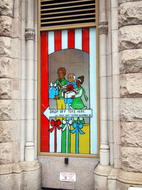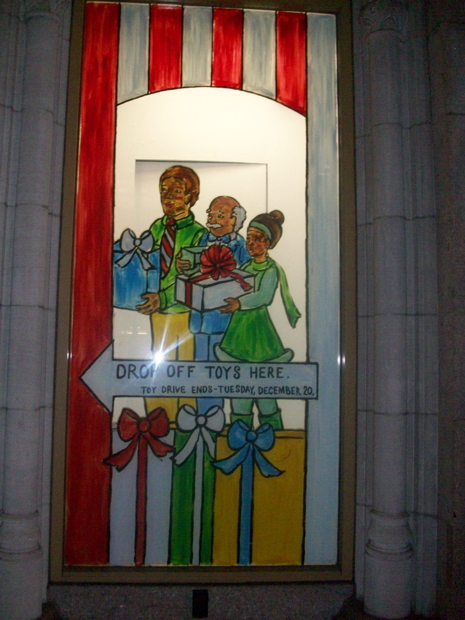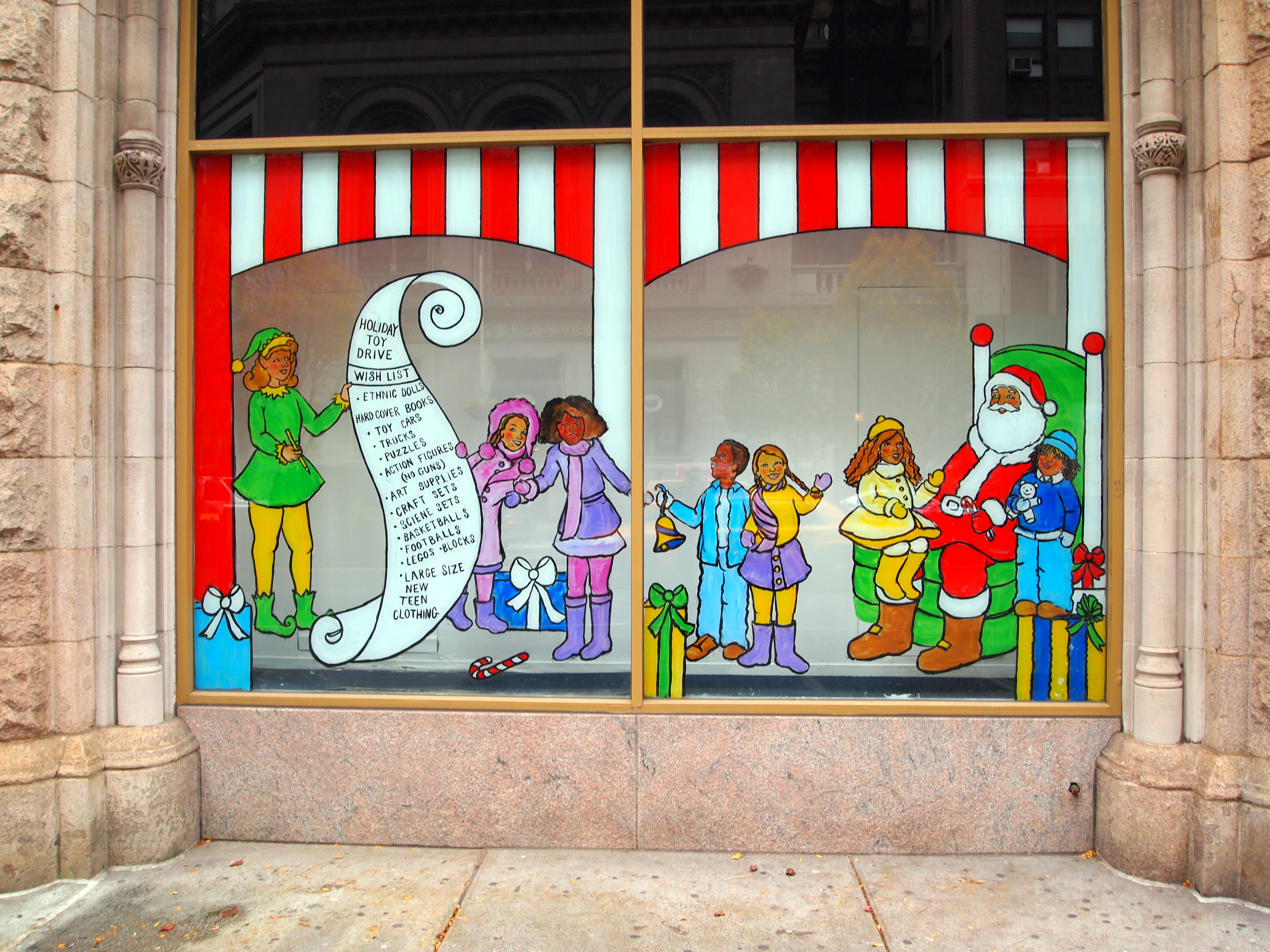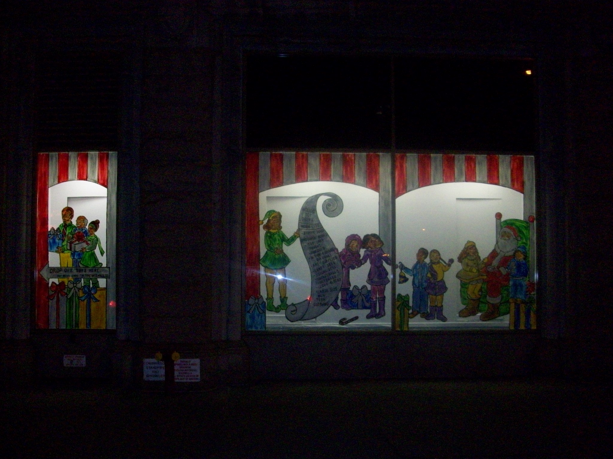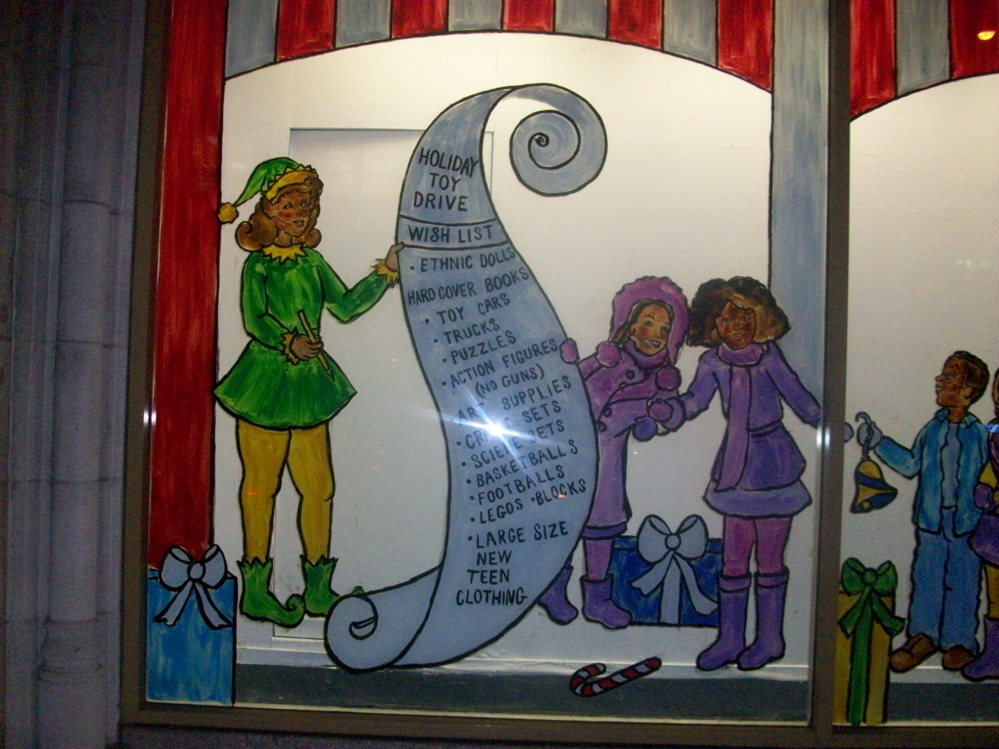 As you can see they have some nice, super large street-level windows. They have always used printed materials to advertise their annual toy drive but have been unhappy with how quickly ink on printed cardboard fades in the sun.