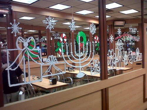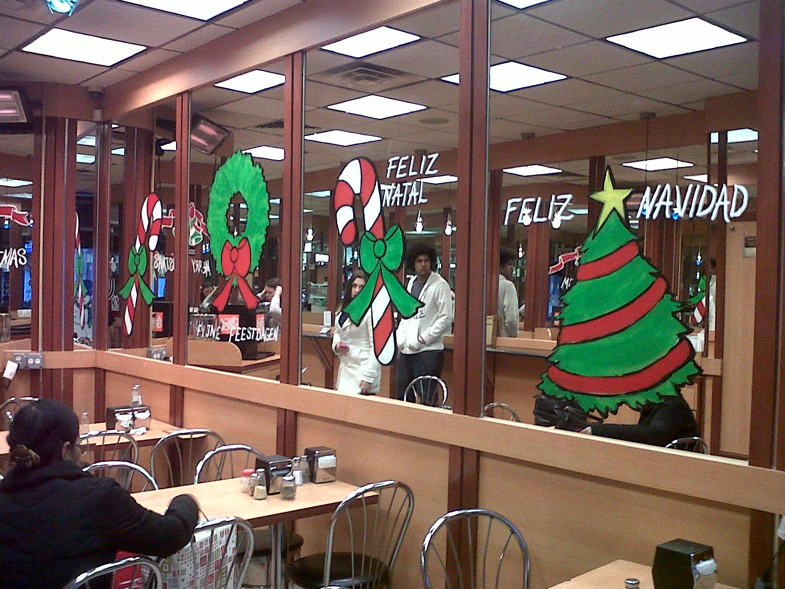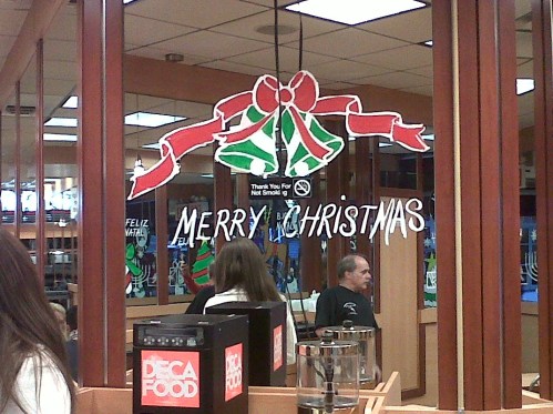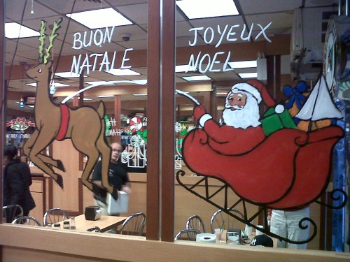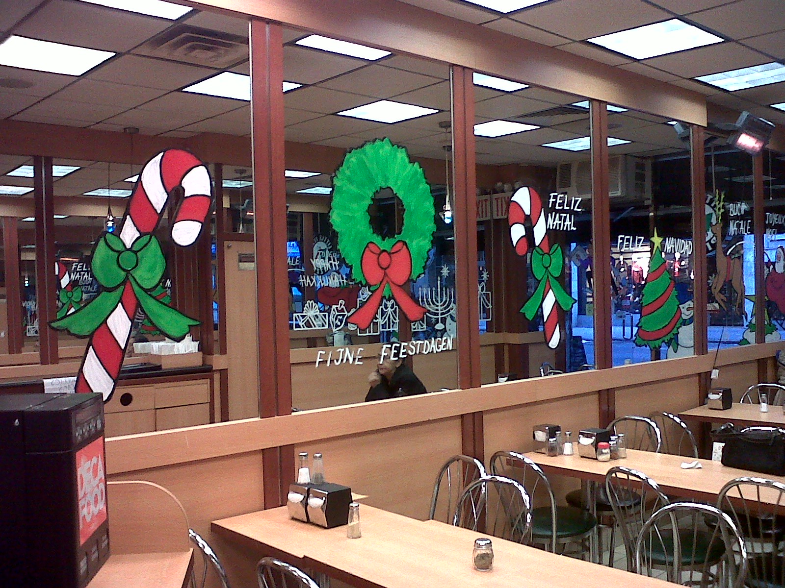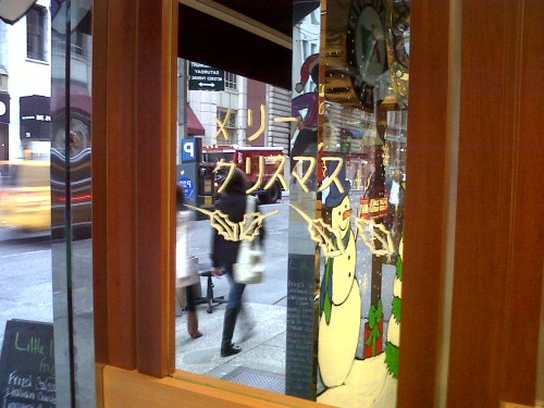 And so evolved the international Happy Holidays theme at Little Italy Pizza! I wrote Merry Christmas in 7 different languages and Happy Hanukkah in Hebrew, so that makes a total of eight for the holidays. This first one is Japanese. He said I wrote out the characters better than he does. How sweet!