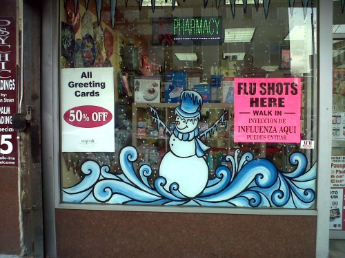 You can get a flu shot here! Muhammad was interested in keeping the painting up past Christmas and New Years and liked the snow men at Fortunatos so icicles and snow men were the order of the day. These windows took about 4 hours to paint.