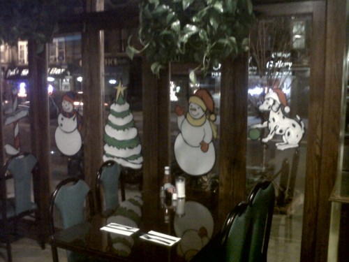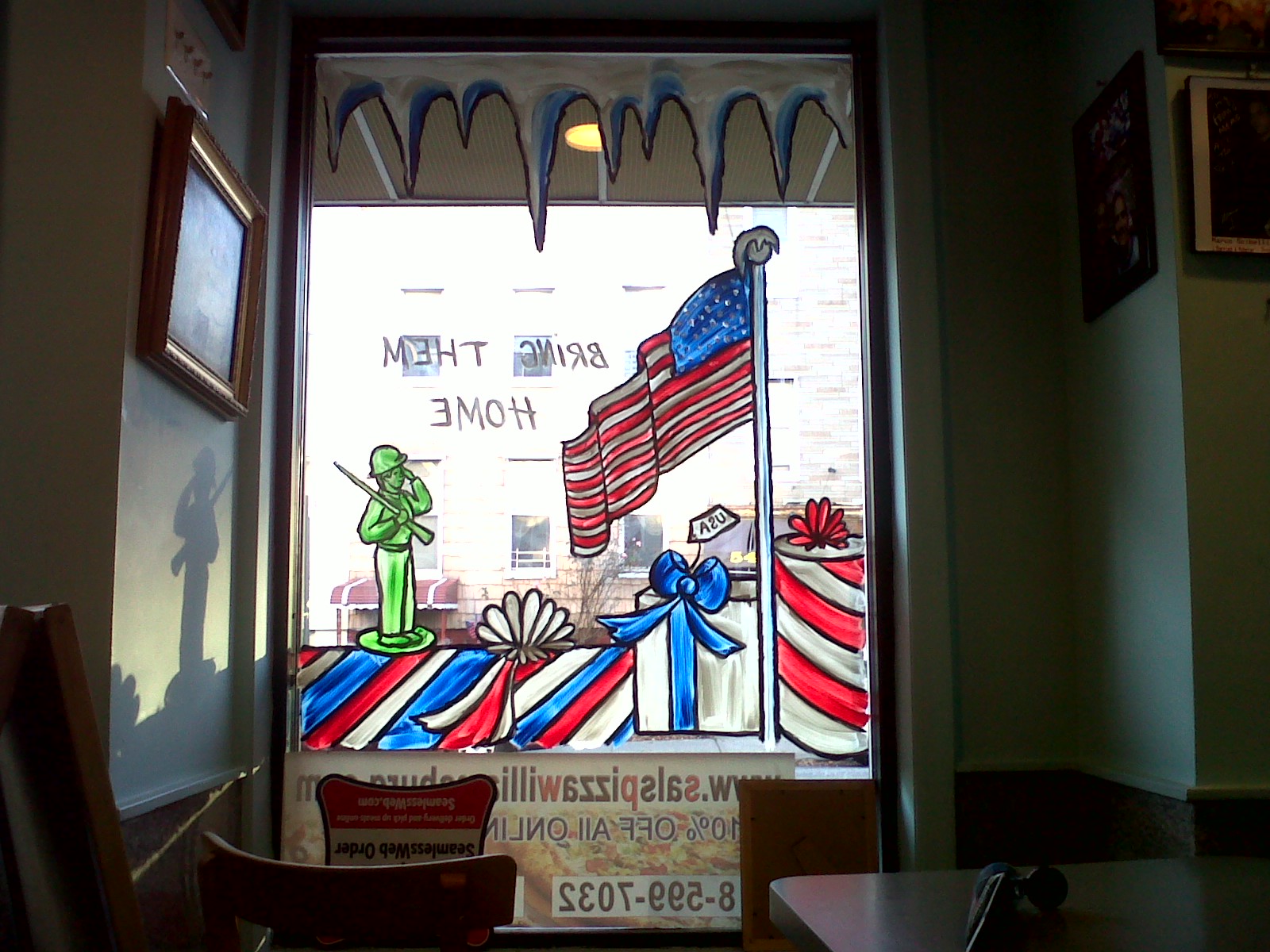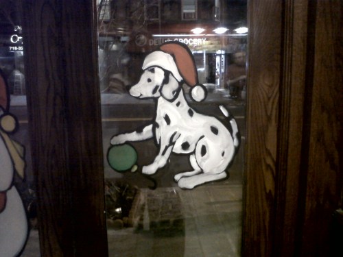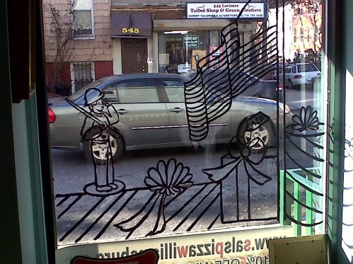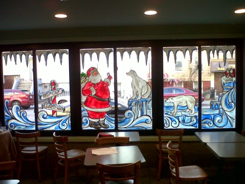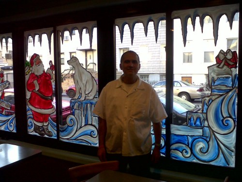 Each year he has a special request for the one lone window on far side of his pizzeria. It usually pertains to some personal neighborhood joke with his friends like the year I drew rats wearing Christmas hats drinking tequila.