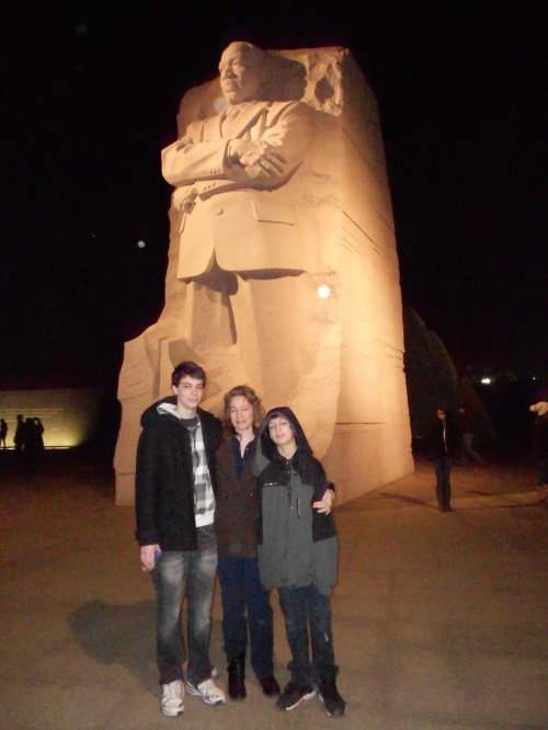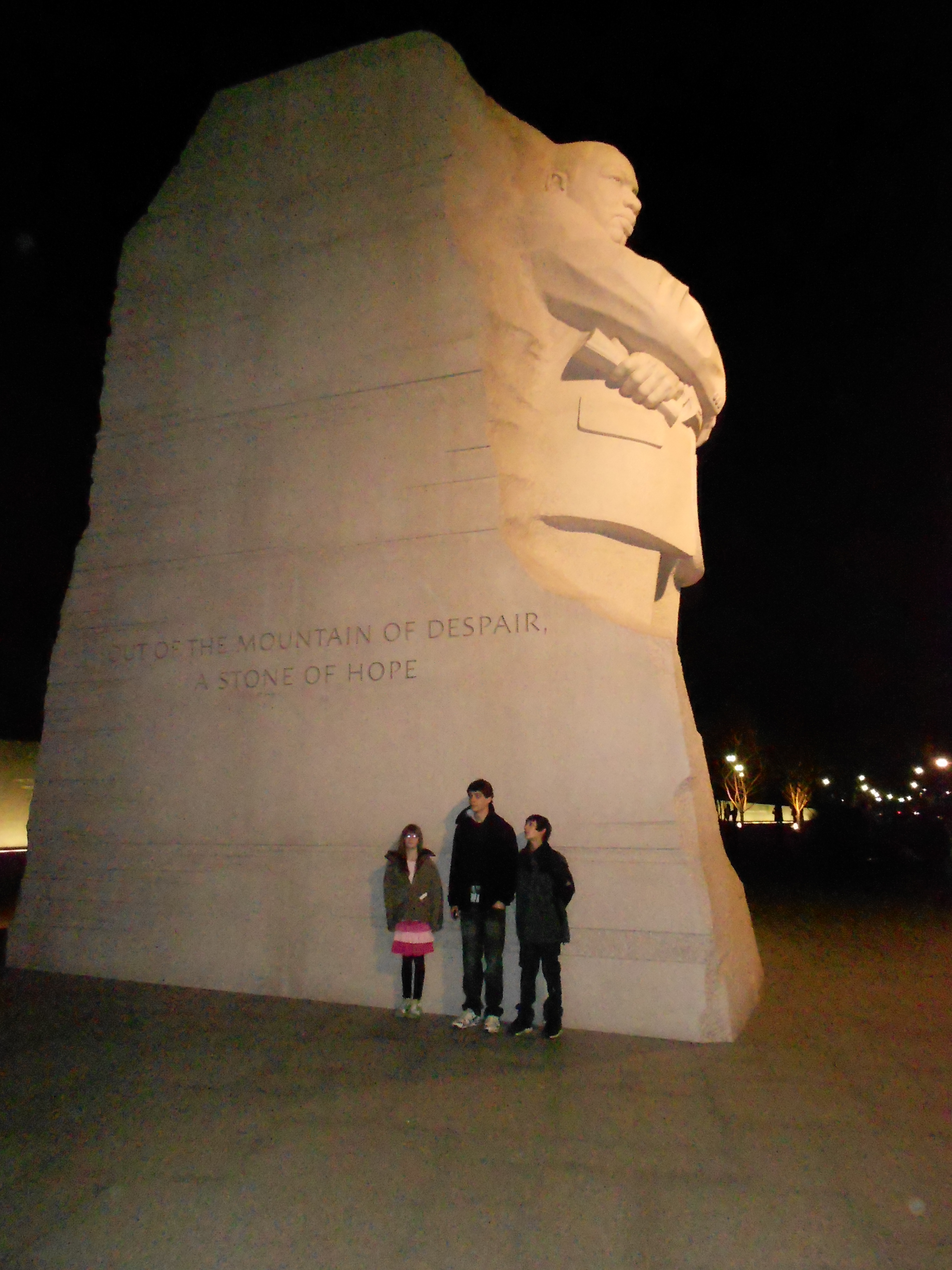 Finally, we came upon the newly unveiled Martin Luther King Jr. Memorial. It was massive and loomed high into the night atmosphere. I remember some news reports with complaints about the statue. Some authorities were not happy with the quotes that were chosen, the way it was chiseled, etc. But let me tell you, it was totally awesome and flawless to me.