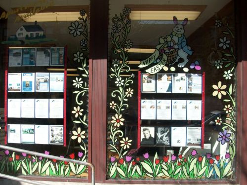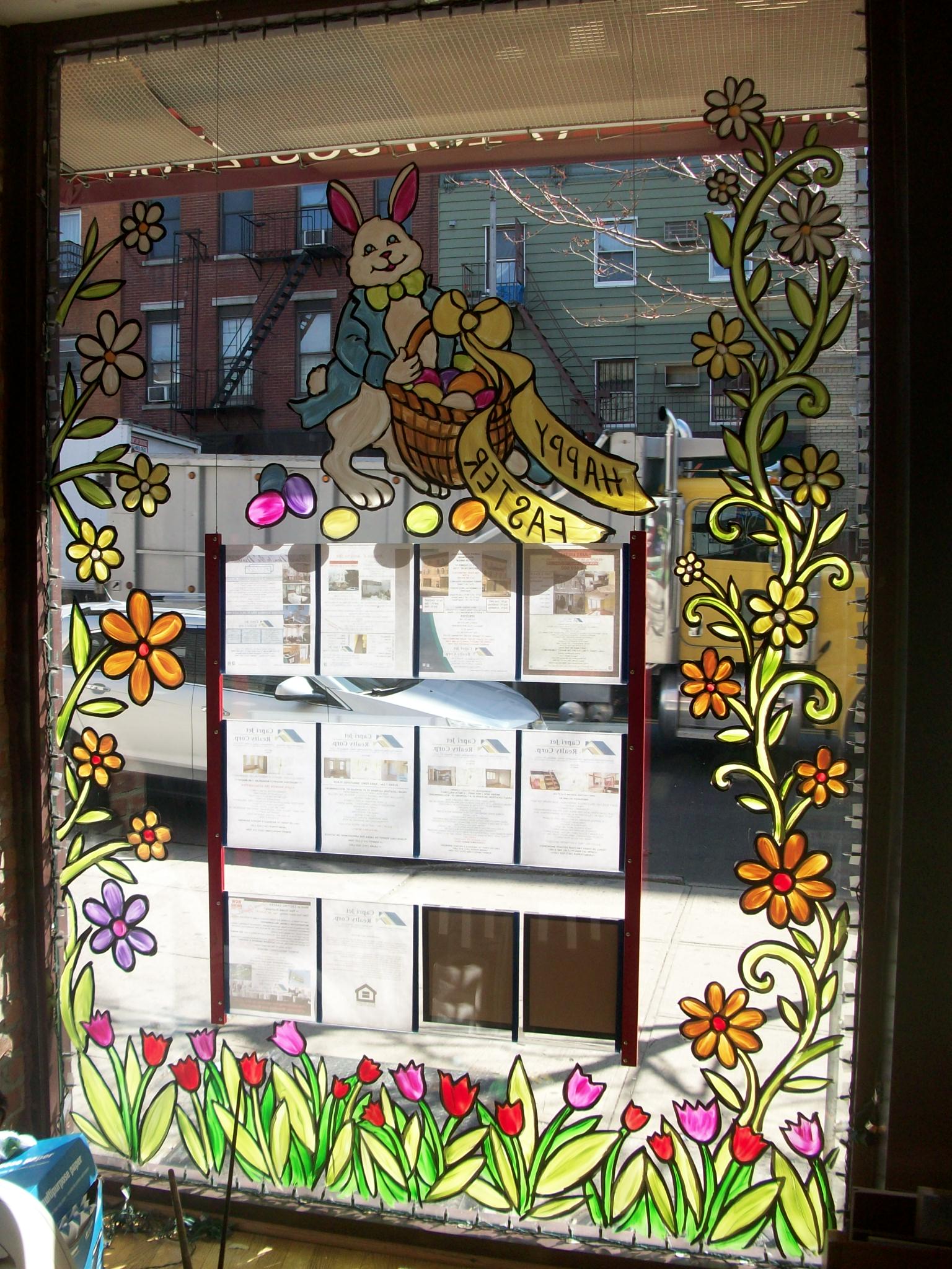My window designs are safely painted on the inside of the windows. The miscreants have to move down the block to the diner to scratch off window paint. Happy Spring!