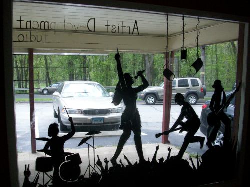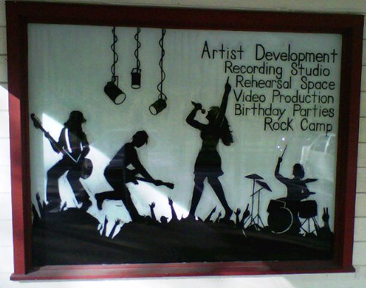 Fast forward to the month of May 2012. The owner, Jim Swain, asked me to paint a rock and roll theme on a large window in his shop. The room was getting a complete makeover, turning it into a really cool hip rehearsal space/birthday party/karaoke room etc.