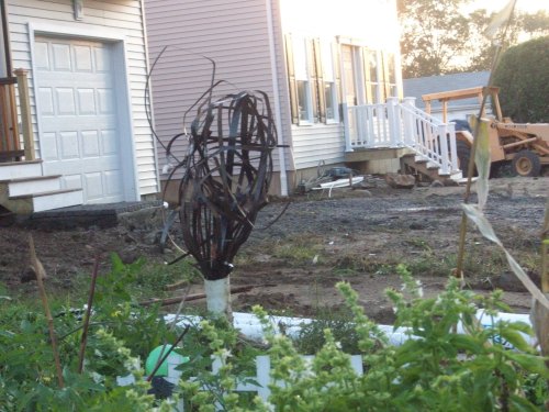 The following morning I informed the builders that I was tired of stepping on those metal strips they left on the ground along the property line by my garden so I made a one of kind sculpture out of them.