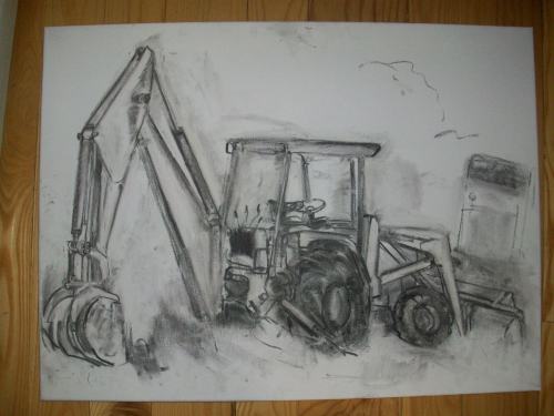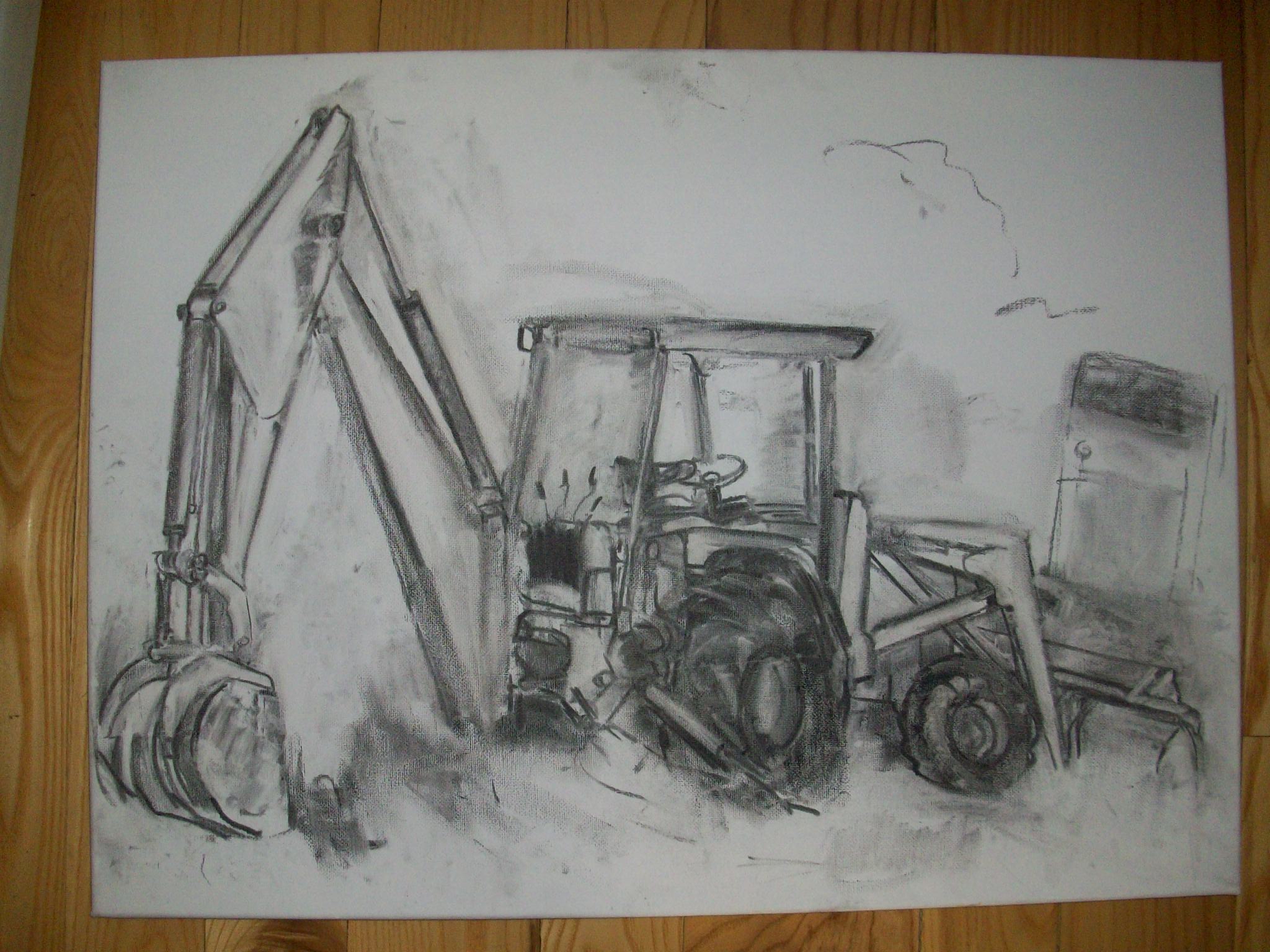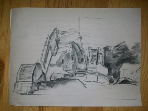This initial sketch convinced me that I could take on this big yellow monster and put him in a painting. The sketch below didn’t transpire beyond a sketch because one of the men would hop on it, move things around like big rocks and never park it the same way twice.