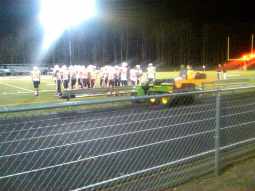 This is my middle child playing at a freshman football game two days later. Despite the fact that half this town had no electricity and no one went to school all week long, GAME ON!