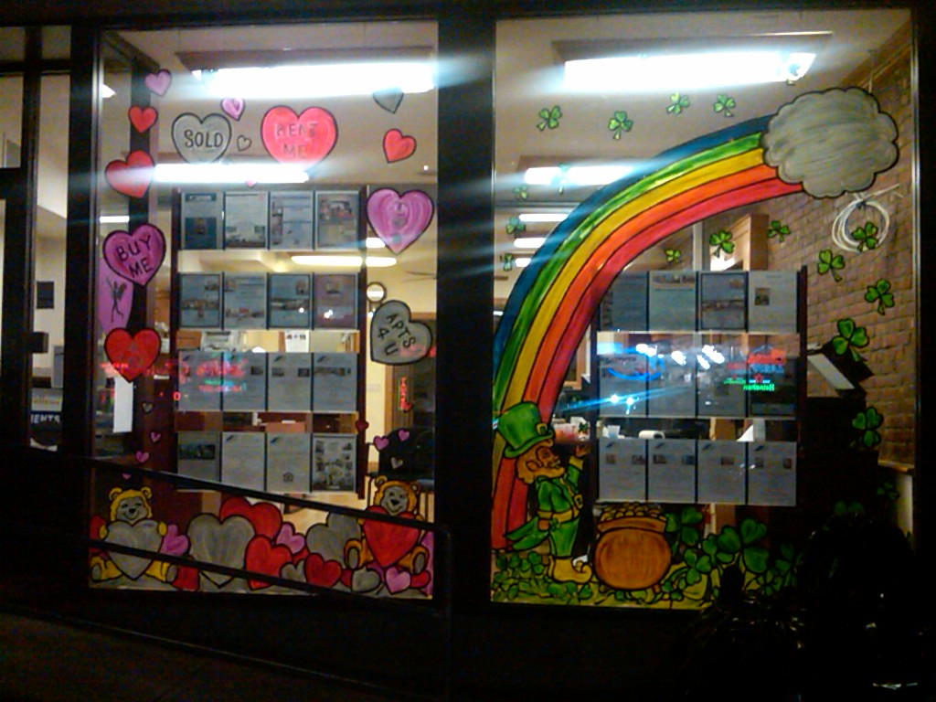 Speaking of Doggie Day Care, here are some St. Patrick’s Day and Valentine’s Day Windows.
