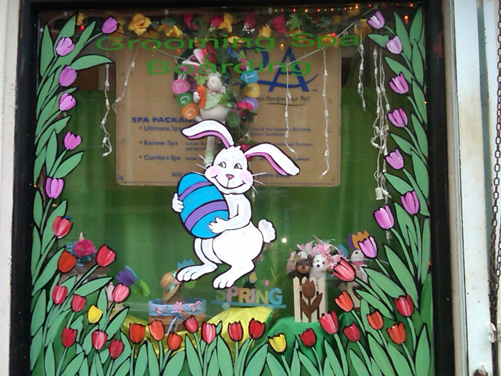 Easter is on it’s way! It came very early this year. Seems I was just catching my breath, recovering from the long and intense weeks of Christmas window painting, when I received a call from Fortunatos, “Can you come paint Easter tomorrow?” And that was before the month of February ended.
