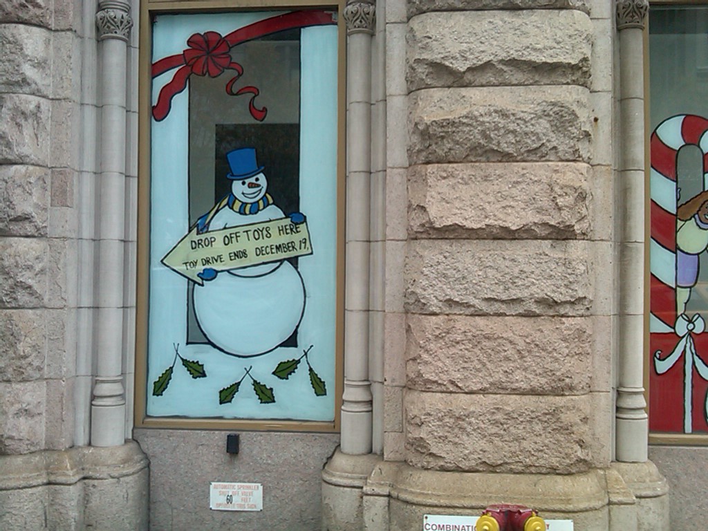 The 2014 Christmas Window Painting Season has begun. Actually it began almost two weeks ago. I’ve been in Manhattan this entire week except for today. Today I was in Brooklyn Painting Sal’s Pizza. He wanted a Santa toy workshop theme.
