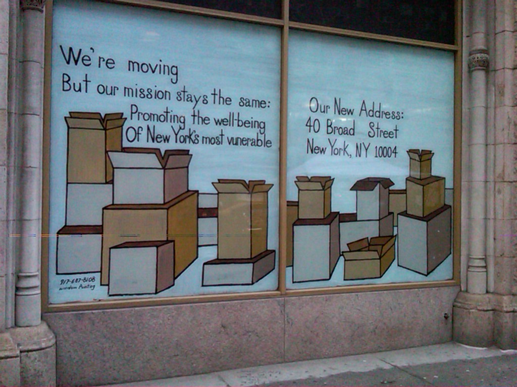 More window painting! Unfortunately, the Federation of Protestant Welfare Agencies has sold the building and they are moving.