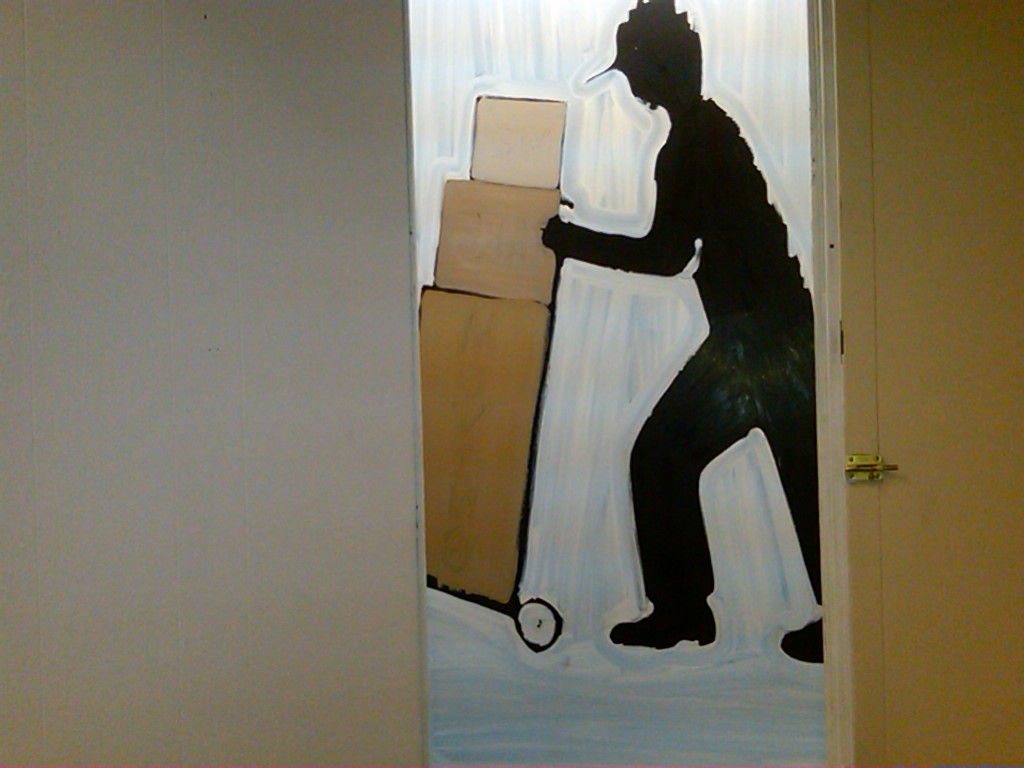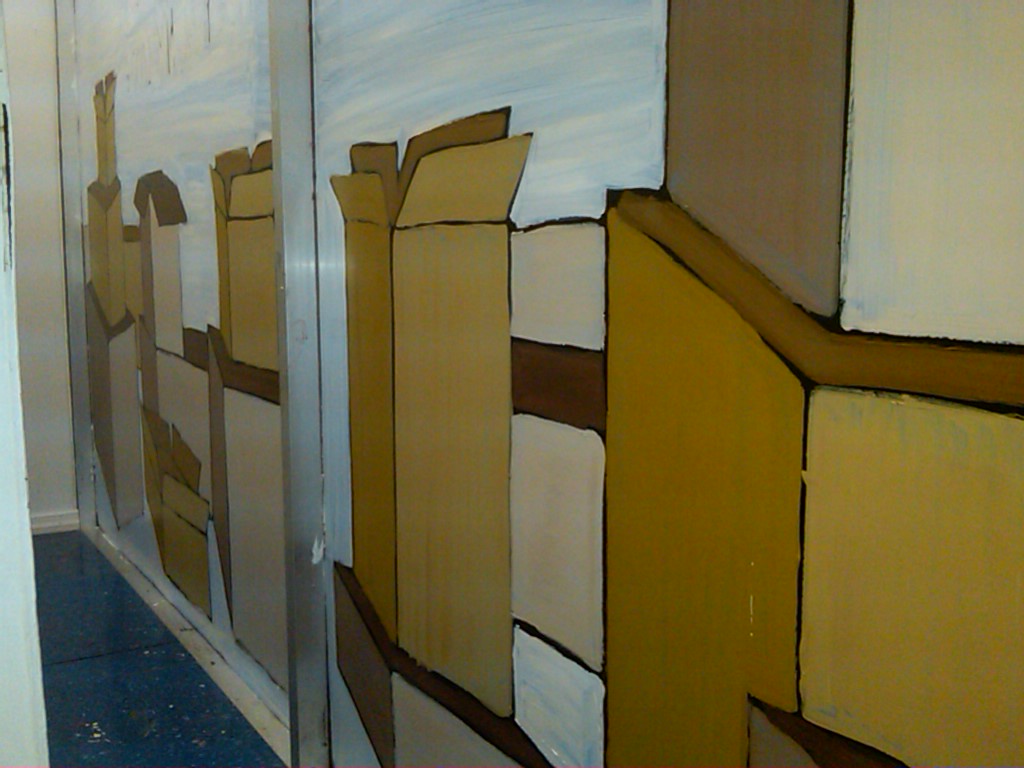 The painted moving boxes juxtaposed with the real moving boxes.