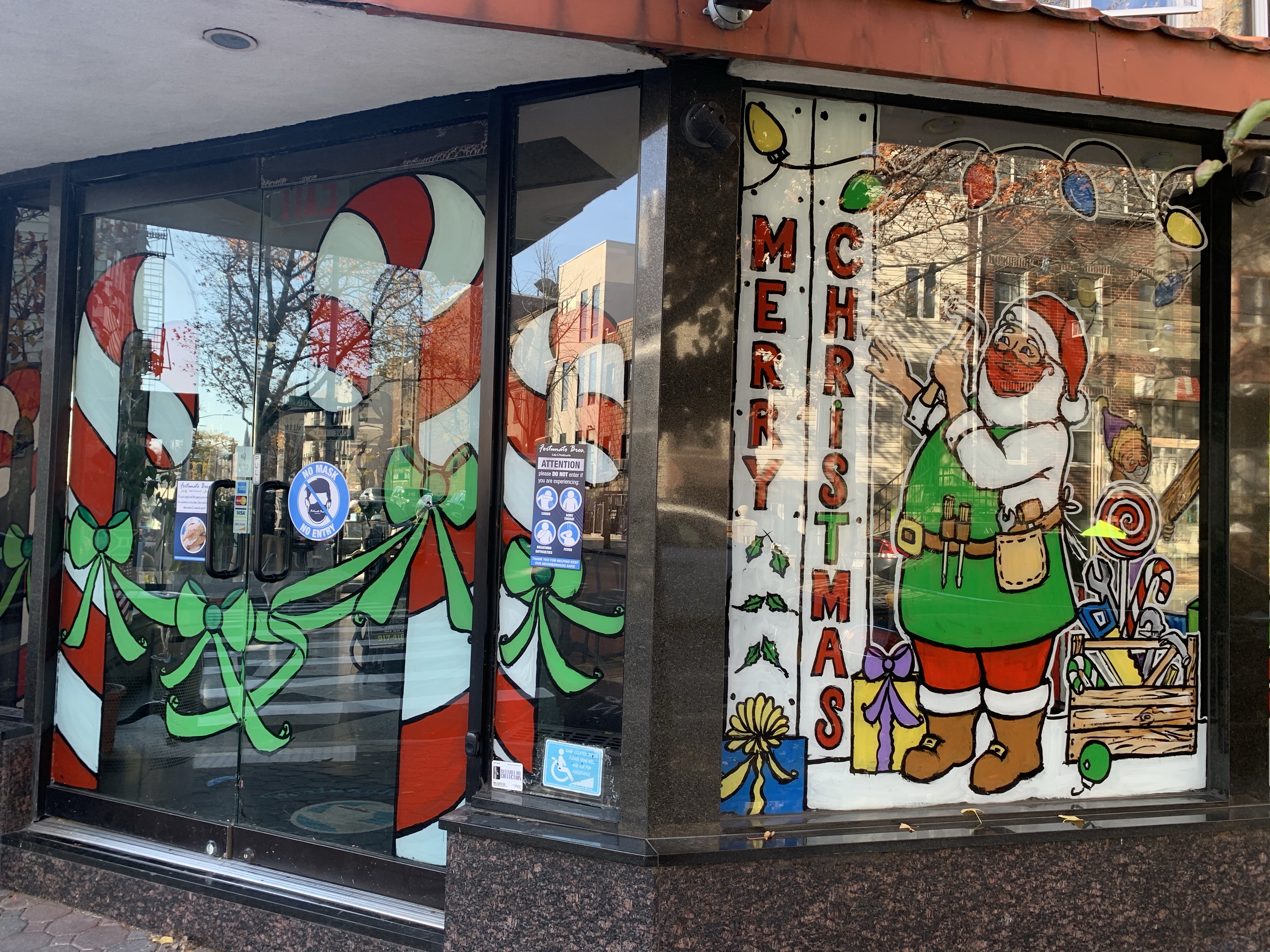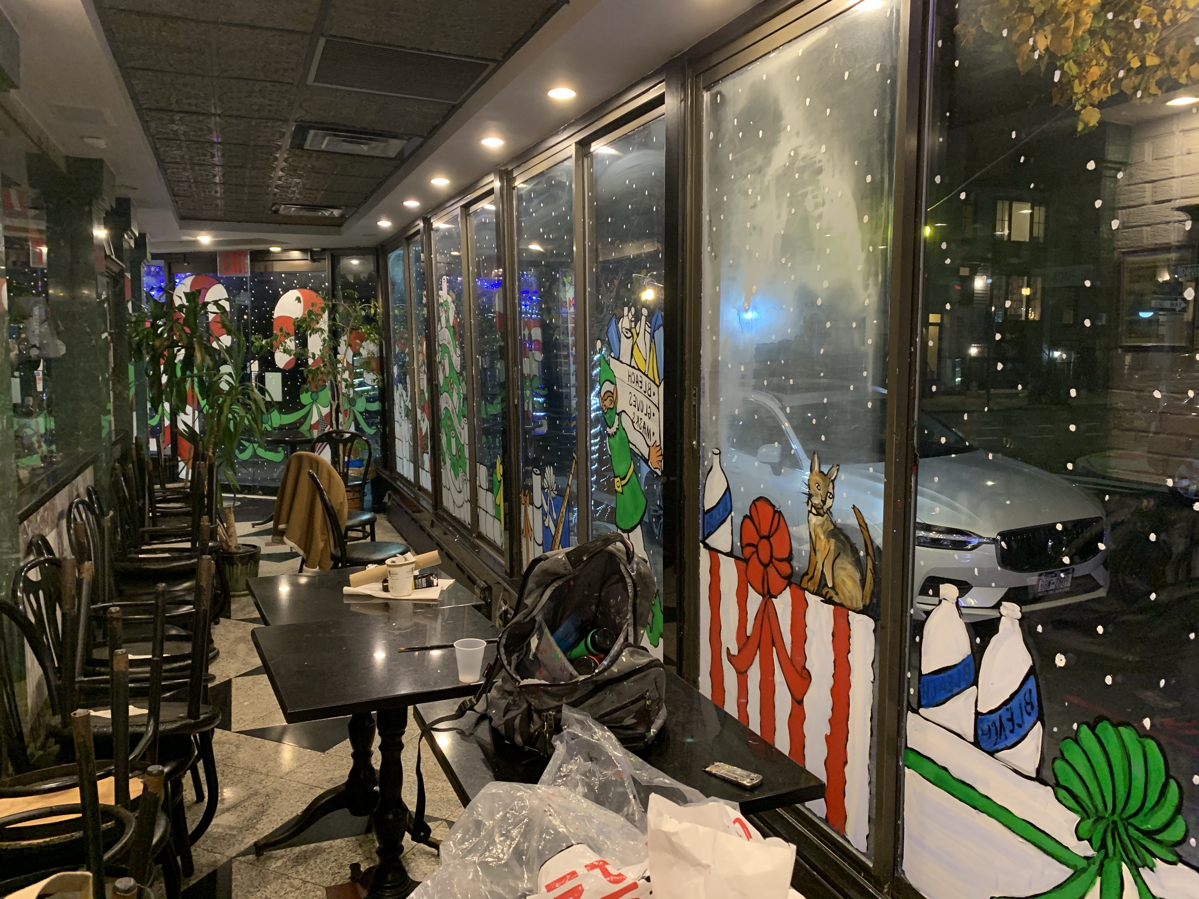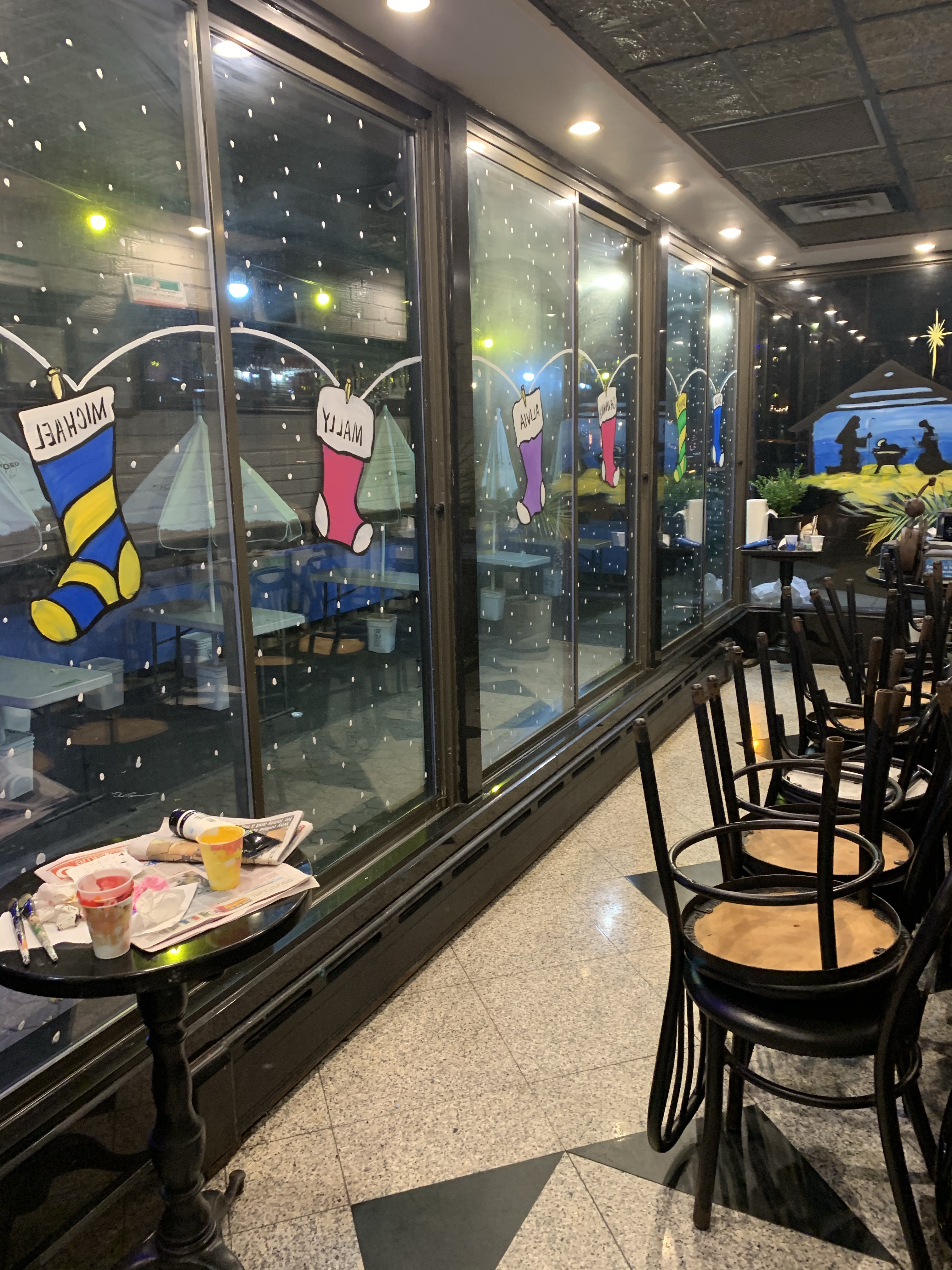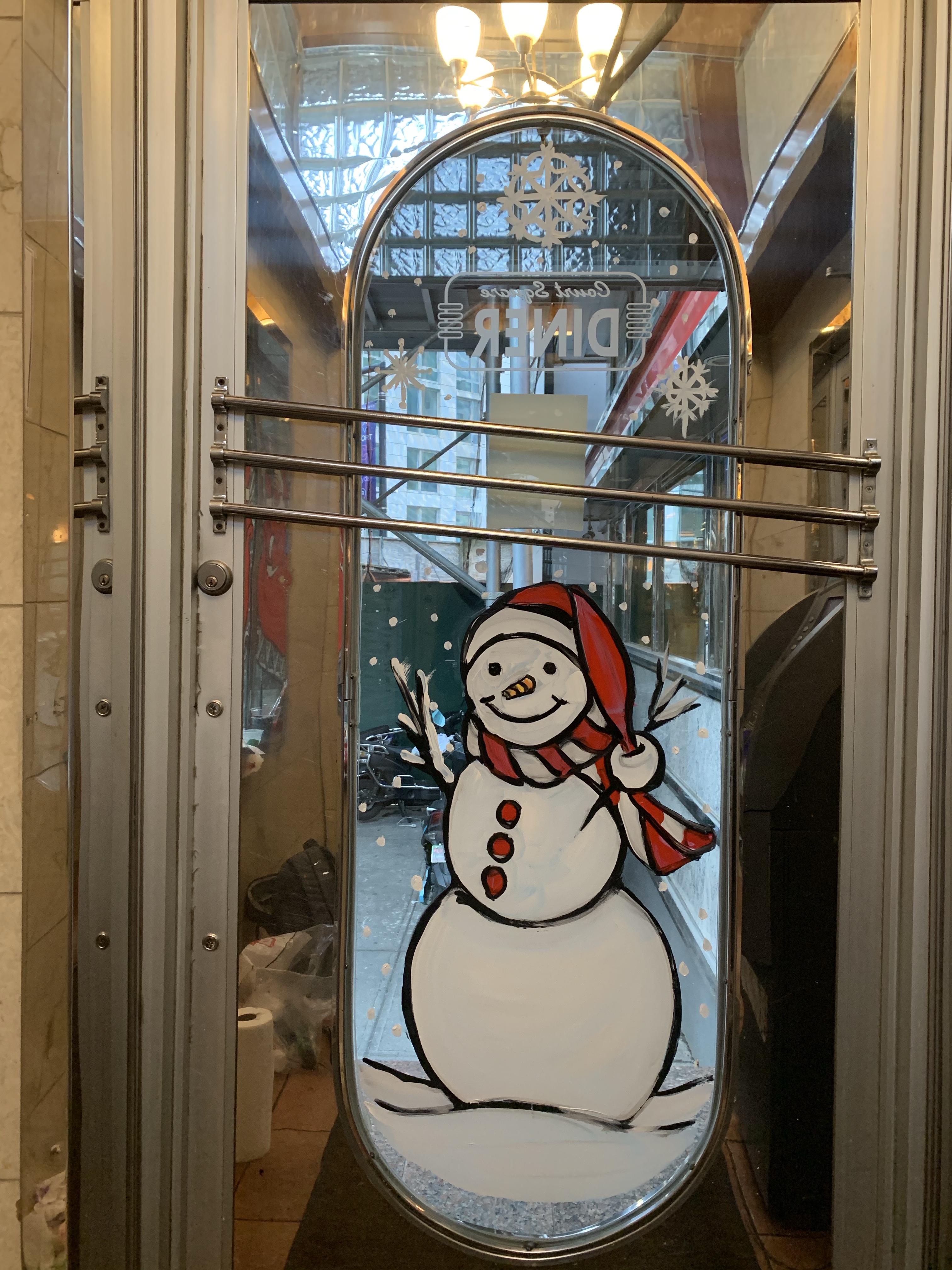 The owner of the court square diner originally said no windows this year because the mayor was going to shut down all indoor dining. “Why should I have the windows painted if I have no customers eating inside?” I said, “Ya, that makes sense to me. I see your point.” But then he said, “ You know what? Come and paint the entryway. People come through there to pick up food.”