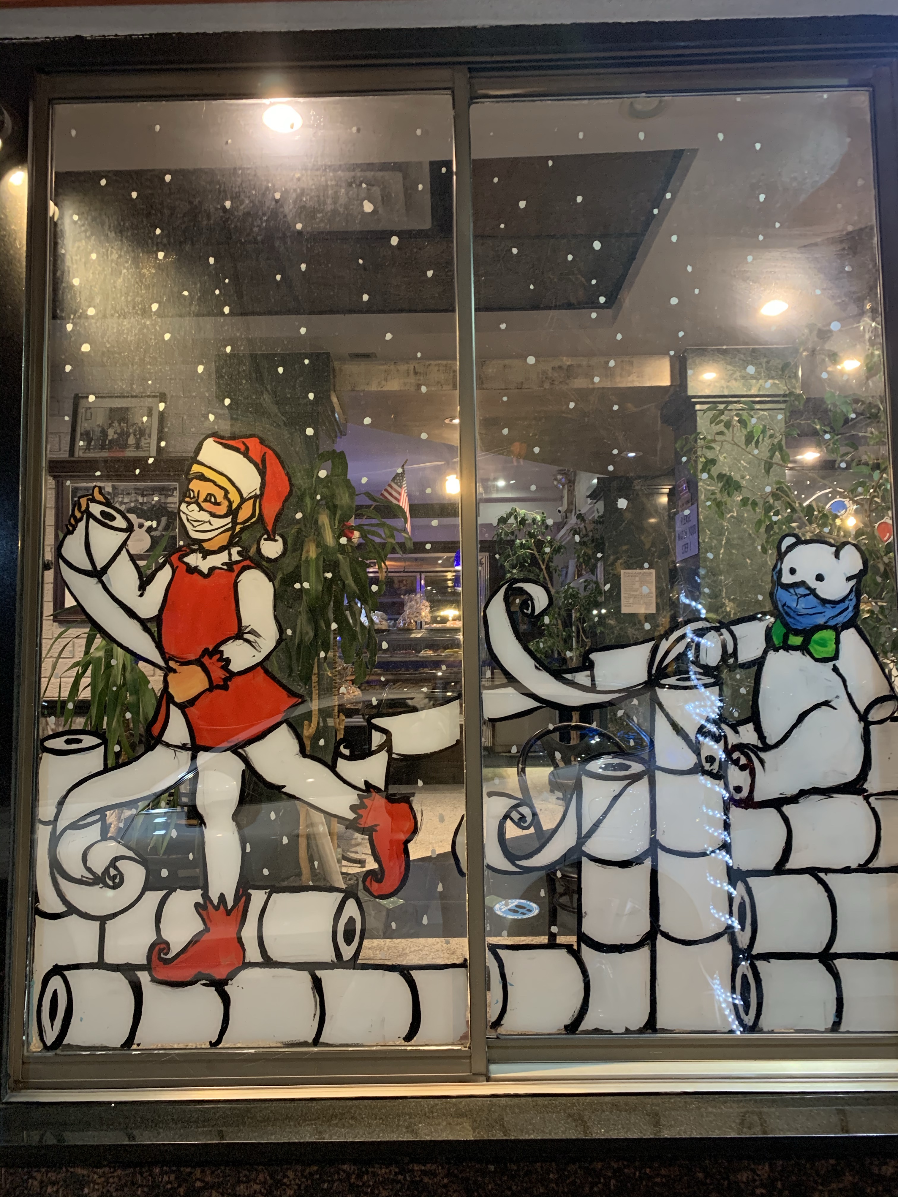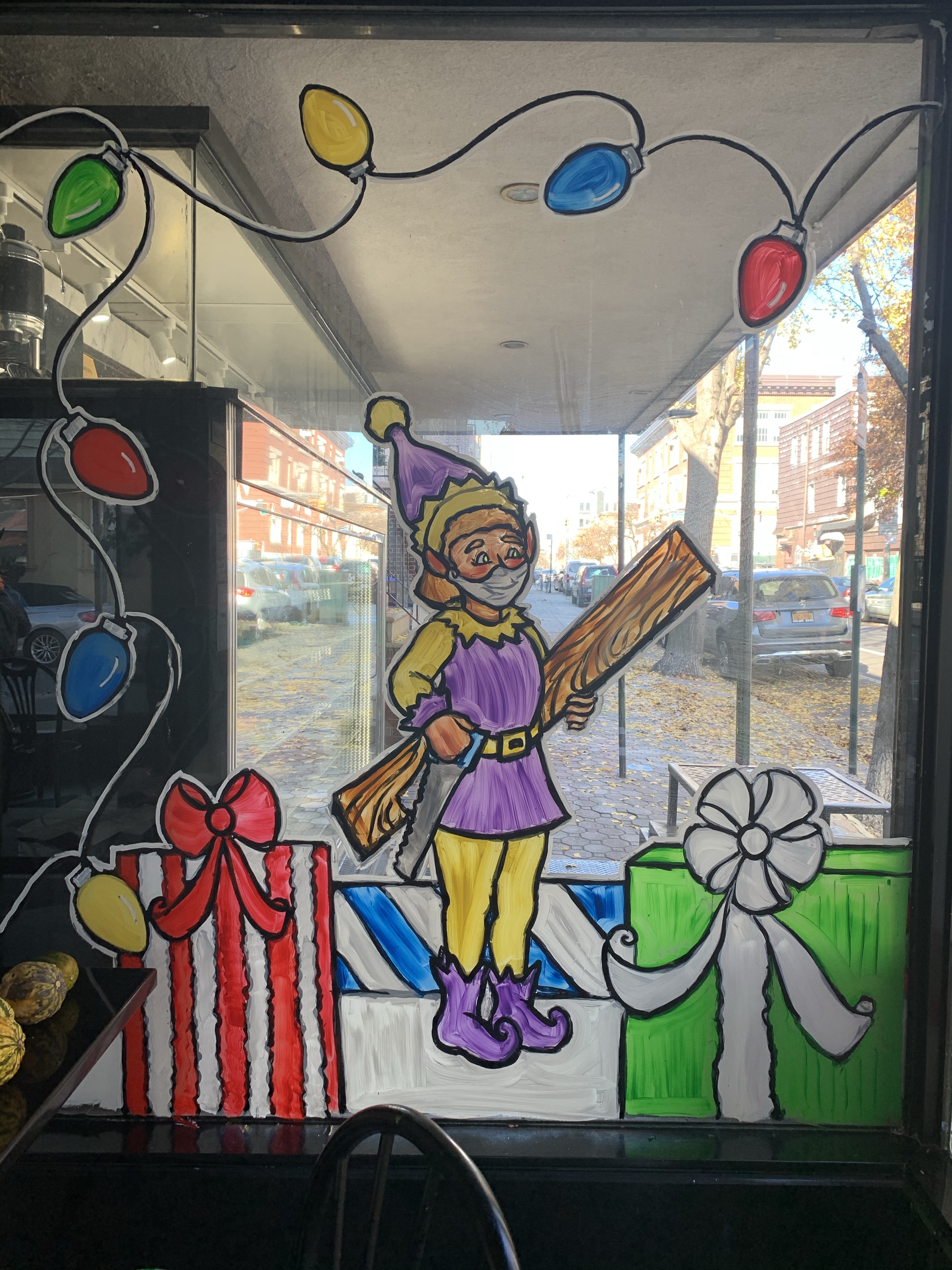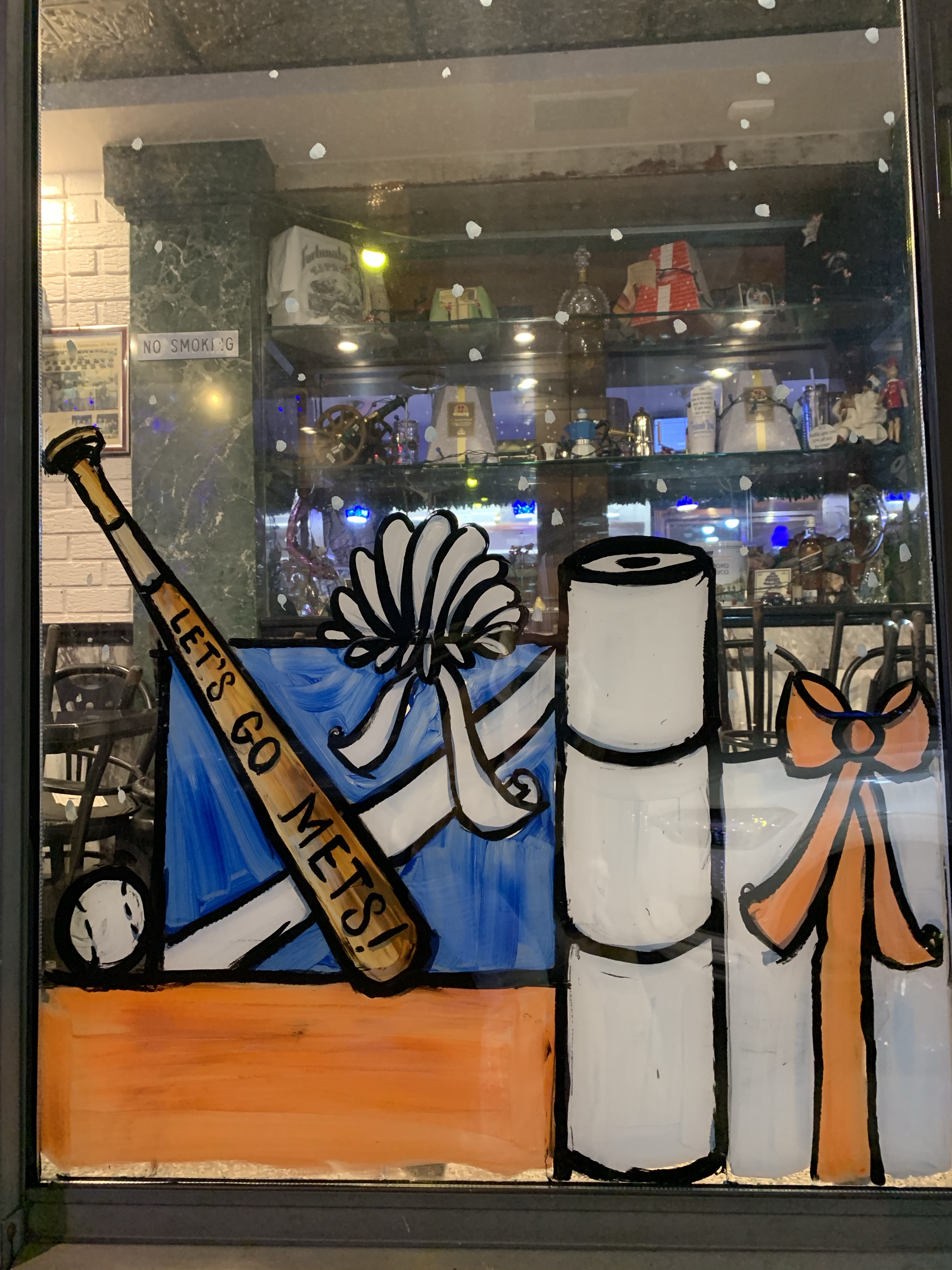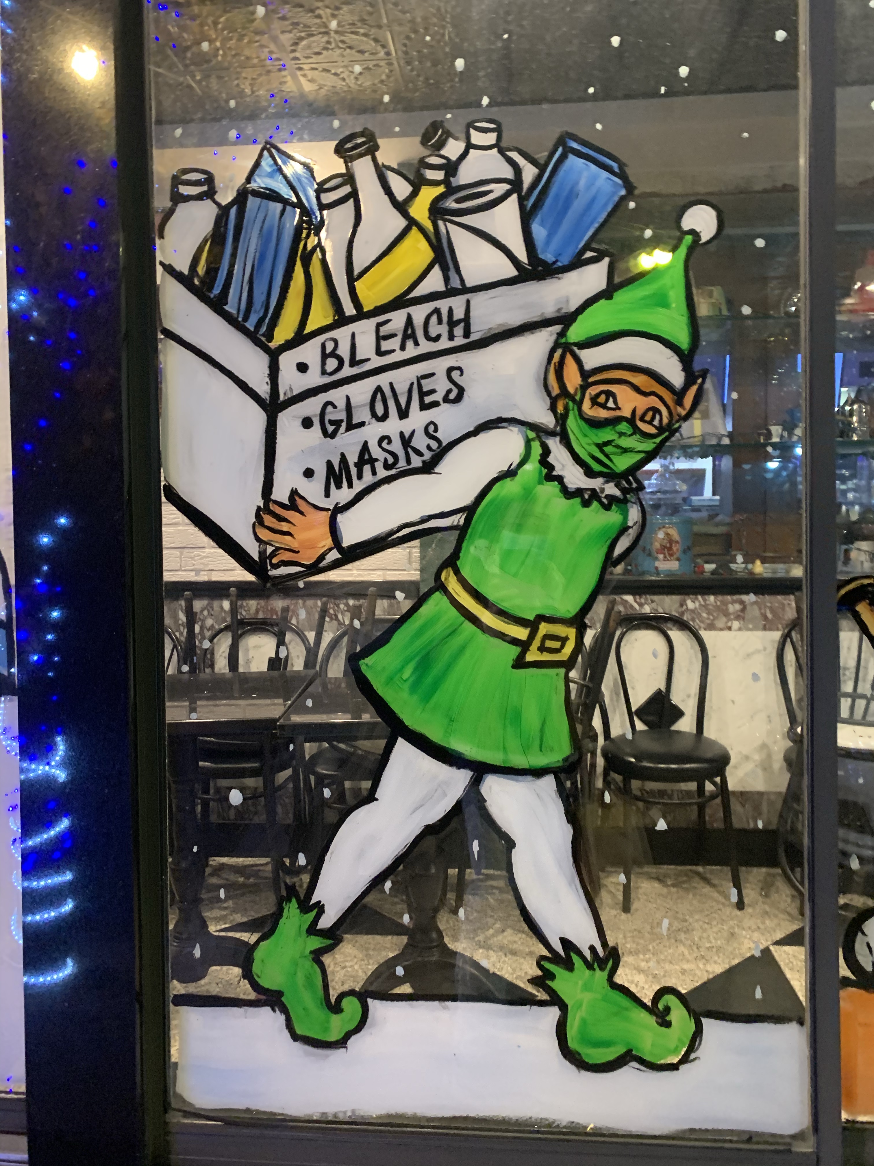 The owner of the court square diner originally said no windows this year because the mayor was going to shut down all indoor dining. “Why should I have the windows painted if I have no customers eating inside?” I said, “Ya, that makes sense to me. I see your point.” But then he said, “ You know what? Come and paint the entryway. People come through there to pick up food.”
