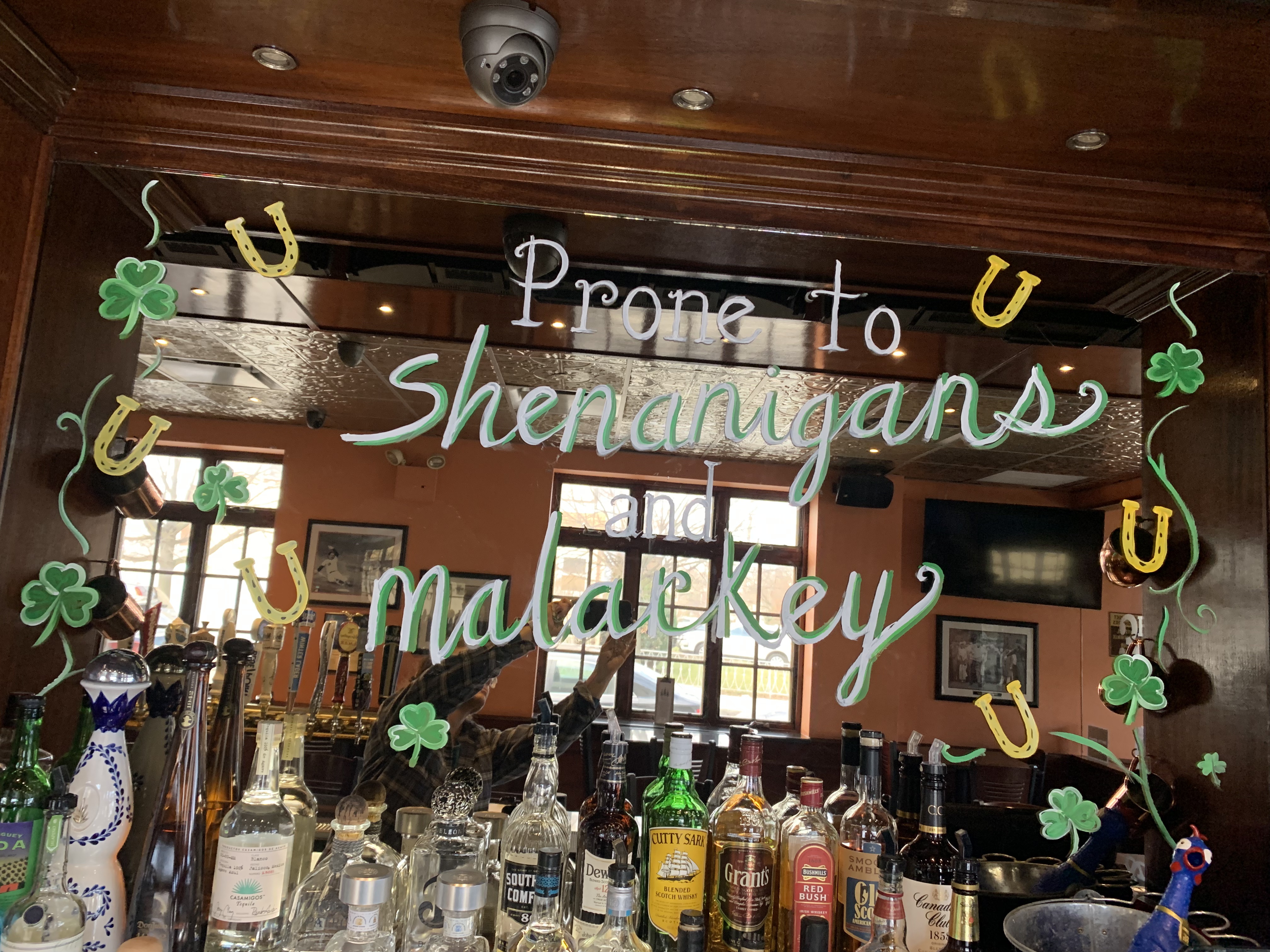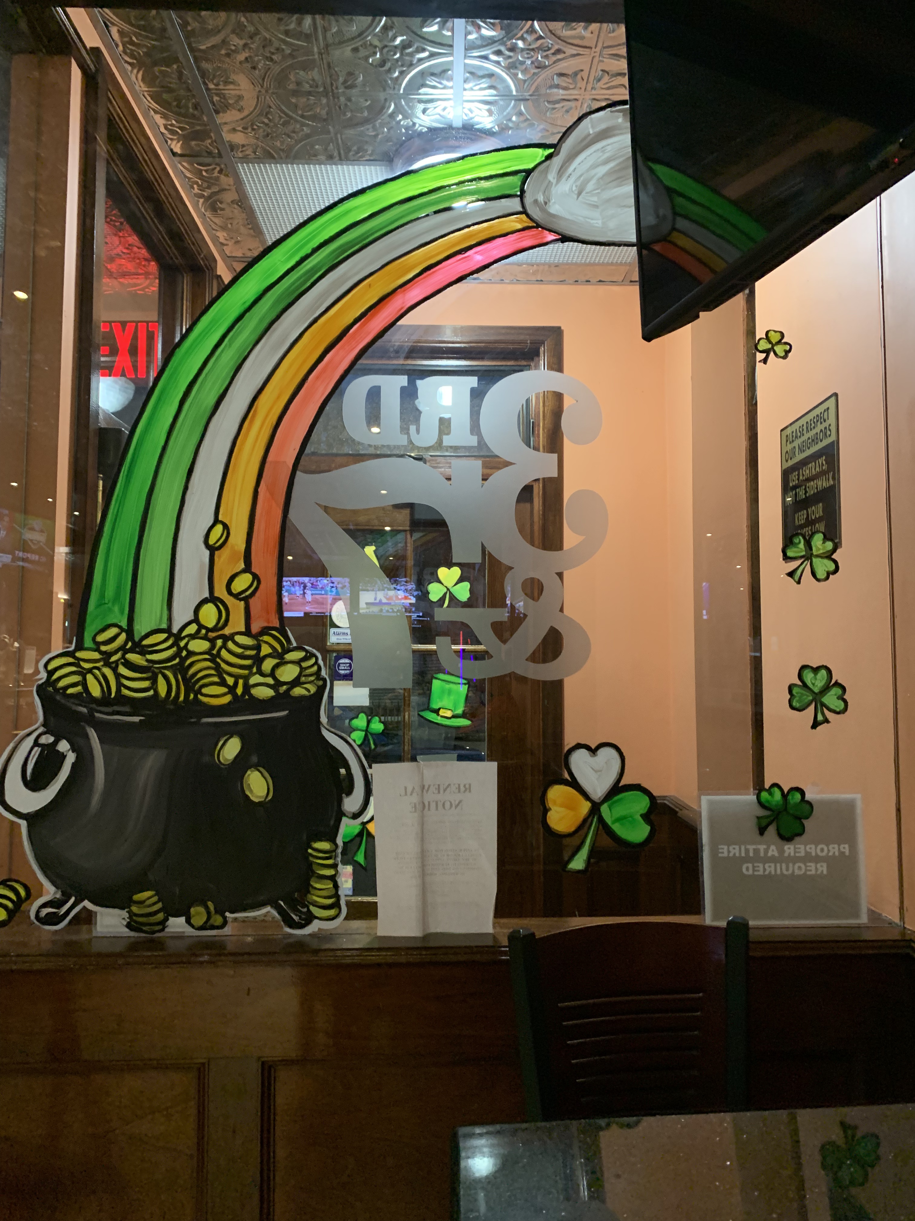 This year marks 31 years of window painting in the NYC area. However, I have only been painting St. Patrick’s Day windows for about 8 years but they are so fun to paint! All of these designs were painted with acrylic paint. They wash off with water/windex and a flat blade.