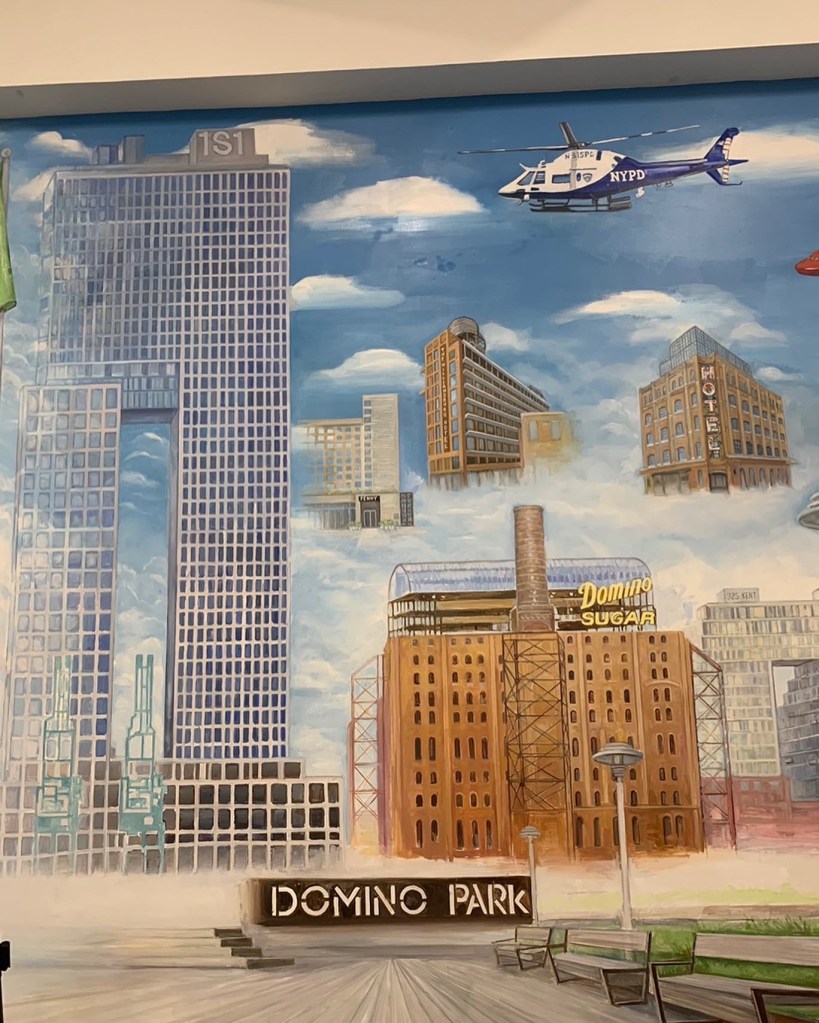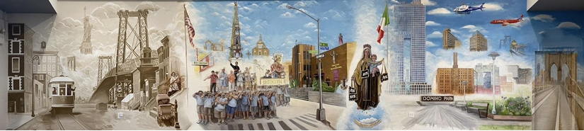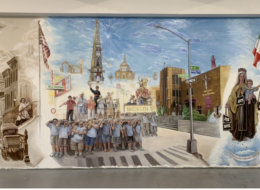 When I was painting this mural at Our Lady of Mr. Carmel last year, January – May 2022, sometimes the large hall was rented out on days I was working. One such group was the extra cast members of Blue Bloods. Throughout this particular day, about 30 or so people quietly filtered in and out of the room but mostly they sat around reading or typing on their computers.